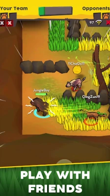 Invite and play against friends or choose a random opponent from the savanna. Choose game mode between 1 vs 1, 2 vs 2 or 3 vs 3. Before each round you select which animals you want to play with. As a predator you have to capture the prey before they have eaten their grass. As a prey you must avoid the sneaky predator while eating the greenest grass to gain full food bar fast.